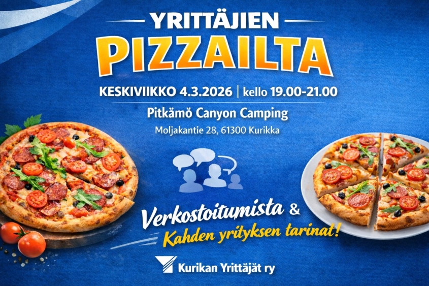 Tervetuloa yrittäjien yhteiseen pizzailtaan Keskiviikko 4.3.2026 klo 19.00–21.00, Pitkämö Canyon Camping, Moljakantie 28, 61300 Kurikka